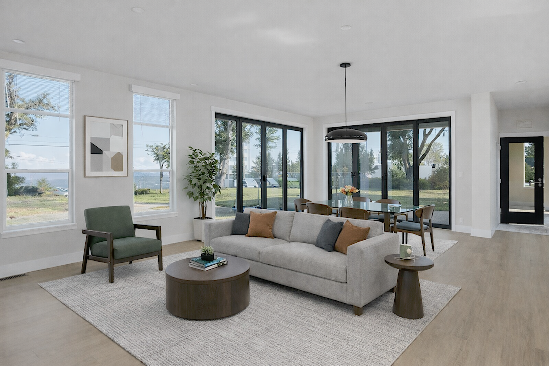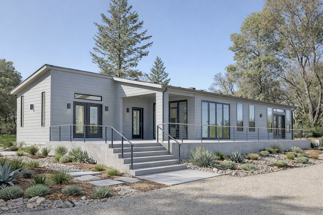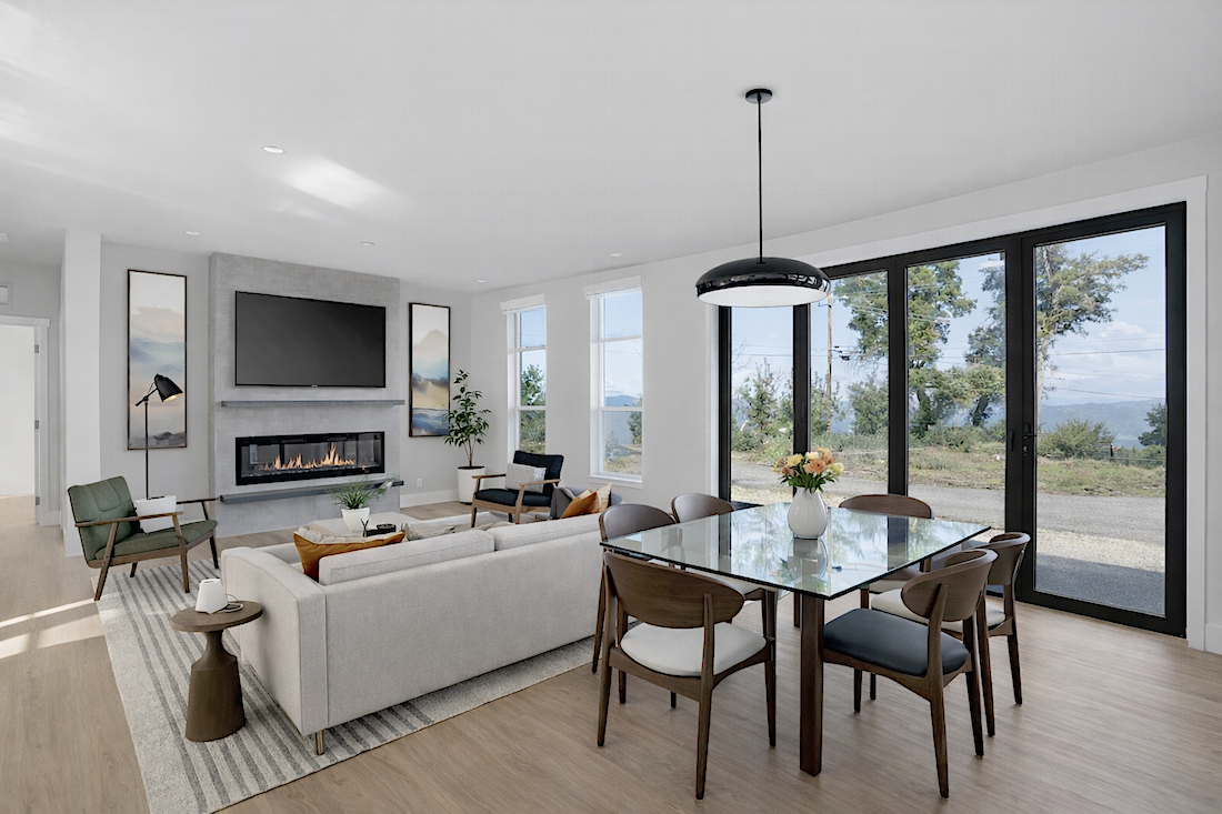 The Amoora 3 is a 1,417-square-foot custom-manufactured home designed for both comfort and connection. With three bedrooms and two bathrooms, the layout reflects Joy Line’s modern design approach: open, bright, and rooted in simplicity. The 9-foot flat ceilings and large glass openings give every room an airy, welcoming feel while maintaining an intimate scale suited to its mountain setting.