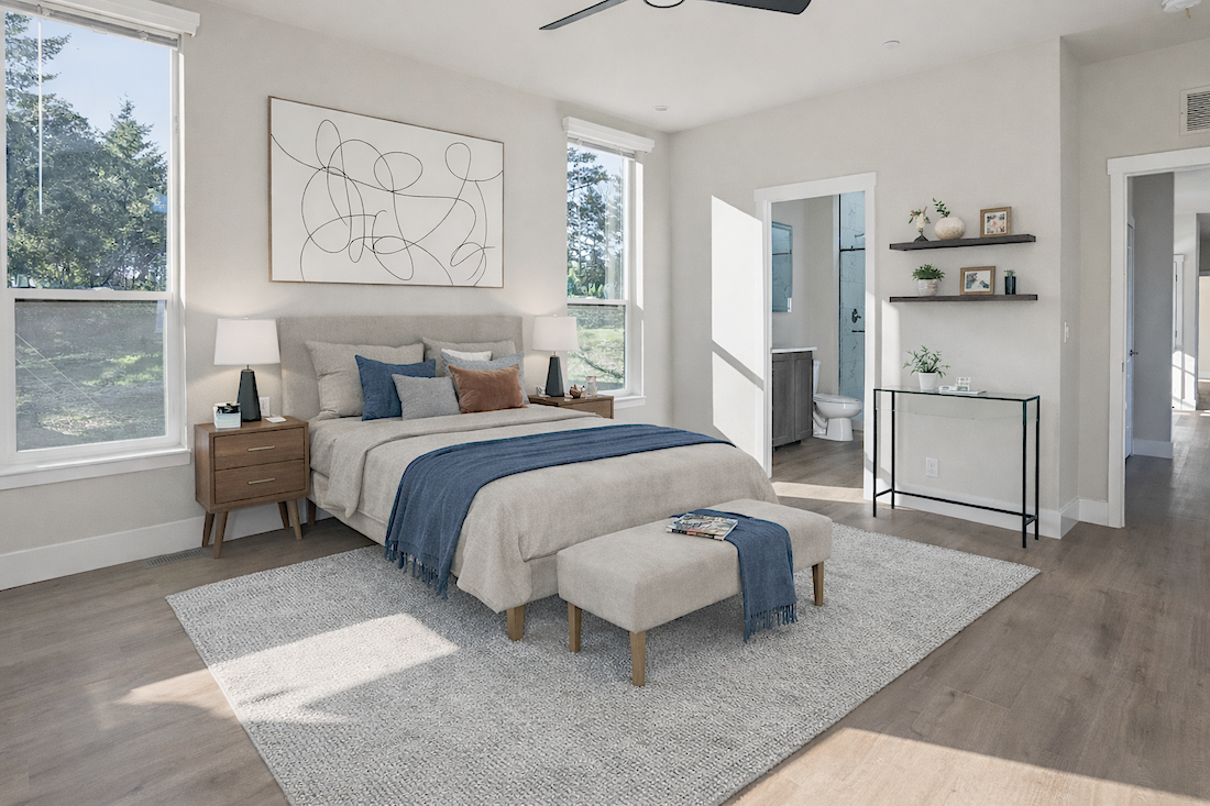 The primary suite offers a quiet retreat with a walk-in bathroom, a large walk-in shower, and French doors that lead to a private patio deck. Natural materials, soft light, and surrounding forest views create a calm and restorative atmosphere. The two additional bedrooms share a full bath, offering flexibility for guests, family, or a home office.