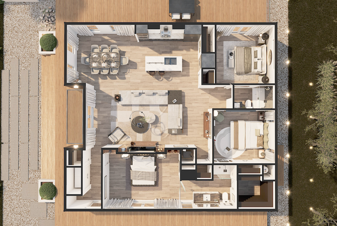 The largest of our models, The Madrone’s focus is on an open-feel central living space, with plenty of room to entertain and enjoy being home together.
